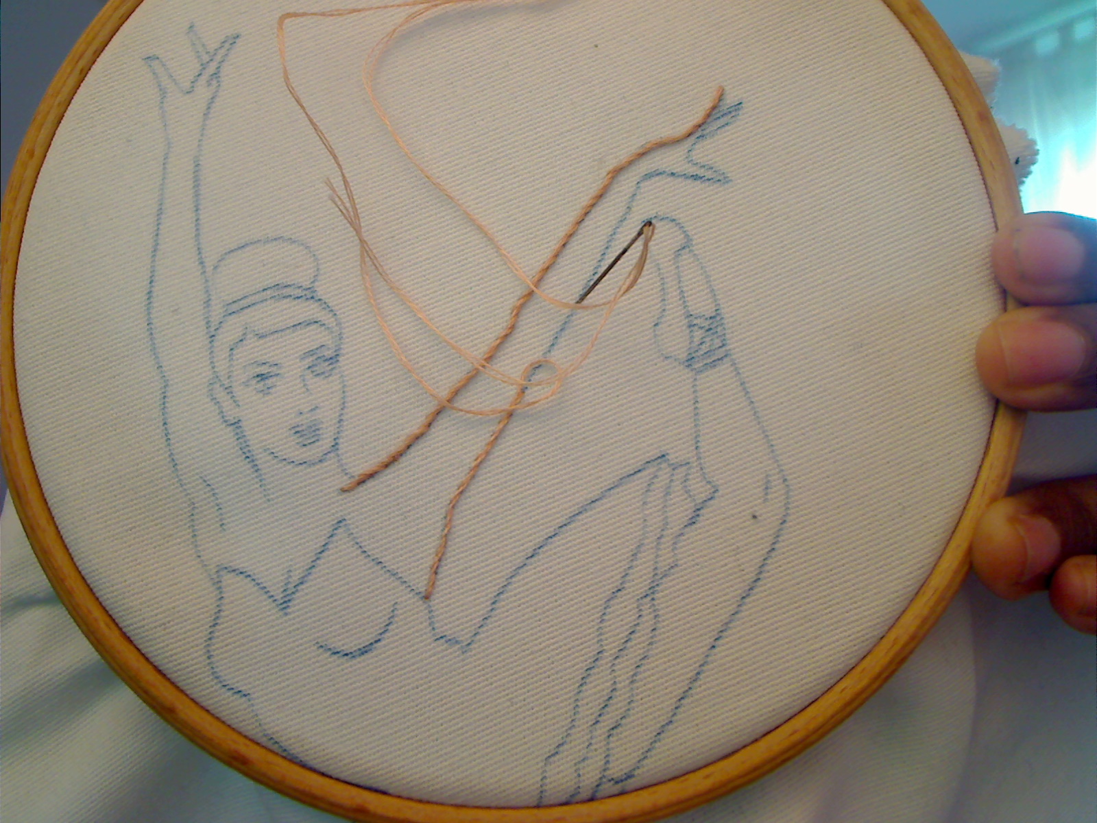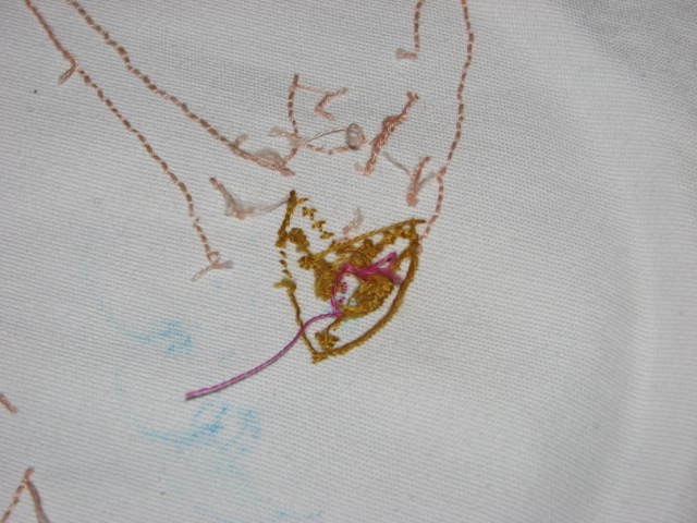 Sadly, after not too long I began resenting my choice. I wasn’t happy knowing that each element of the piece would be a challenge. Differently from when I’ve embroidered the hunk pillow, it wasn’t a question of mastering a single stitch, but three or four on a very limited surface: the split stitch, the satin stitch, the tailed french knot and who knows what else would come to my mind.